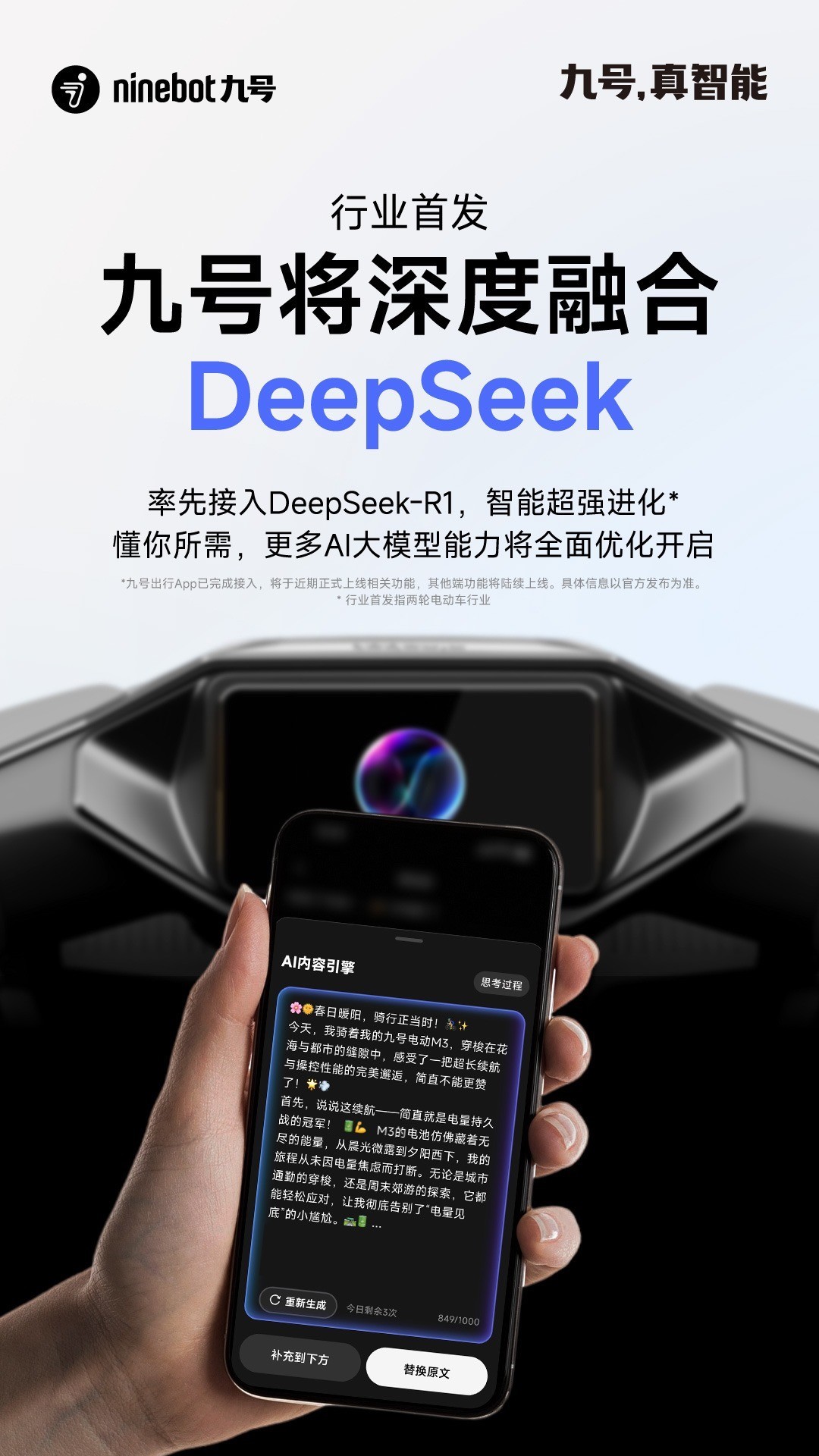 通过接入DeepSeek-R1,九号出行App将大幅提升用户图文创作能力、数据分析、个性化推荐、智能服务等功能,为用户更好地提供车辆控制、出行建议、个性化推荐及售后等服务。DeepSeek强大的AI大模型能力将全方位优化用户体验,进一步拓宽人工智能在两轮电动车领域的应用边界。